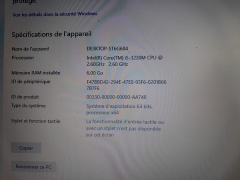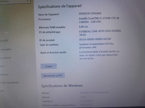 PC portable dell latitude e5530 qui possede un processeur core i5 3230m (2,60 GHZ) et 6 go de ram ddr3. Le disque dur est un disque dur SSD de 1 téra, et la batterie tiens un peu plus de 45 minutes. Le système d'exploitation installé est Windows 10 PRO activé (le logiciel d'origine est windows 7) et les logiciels installés sont des logiciels nécessaires mais gratuits. Le chargeur dell est fourni. Le plastique de tour d'écran a une fissure sans gravité (voir photo). possibilité de poser le PC sur une embase d'alimentation (non fournie). C'est un PC robuste qui peut être utilisé dans des conditions difficiles par sa conception et grâce à son disque dur SSD. (moins fragile aux choques) . Expédition via mondial relay ou colissimo possible. ou retrait sur Bacqueville en Caux - Dieppe